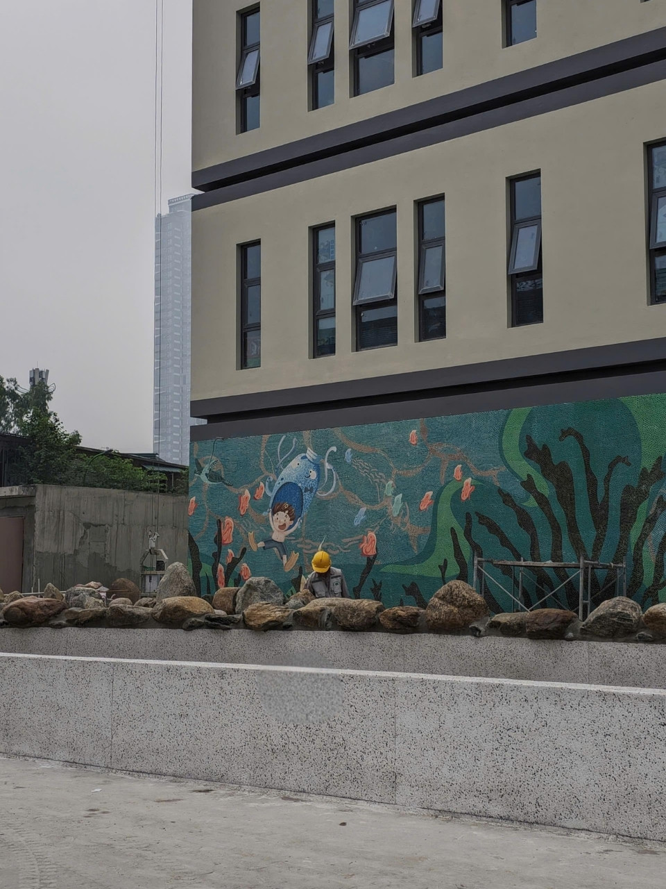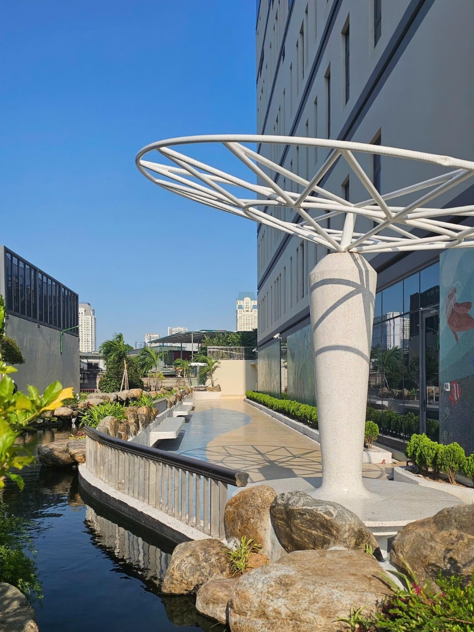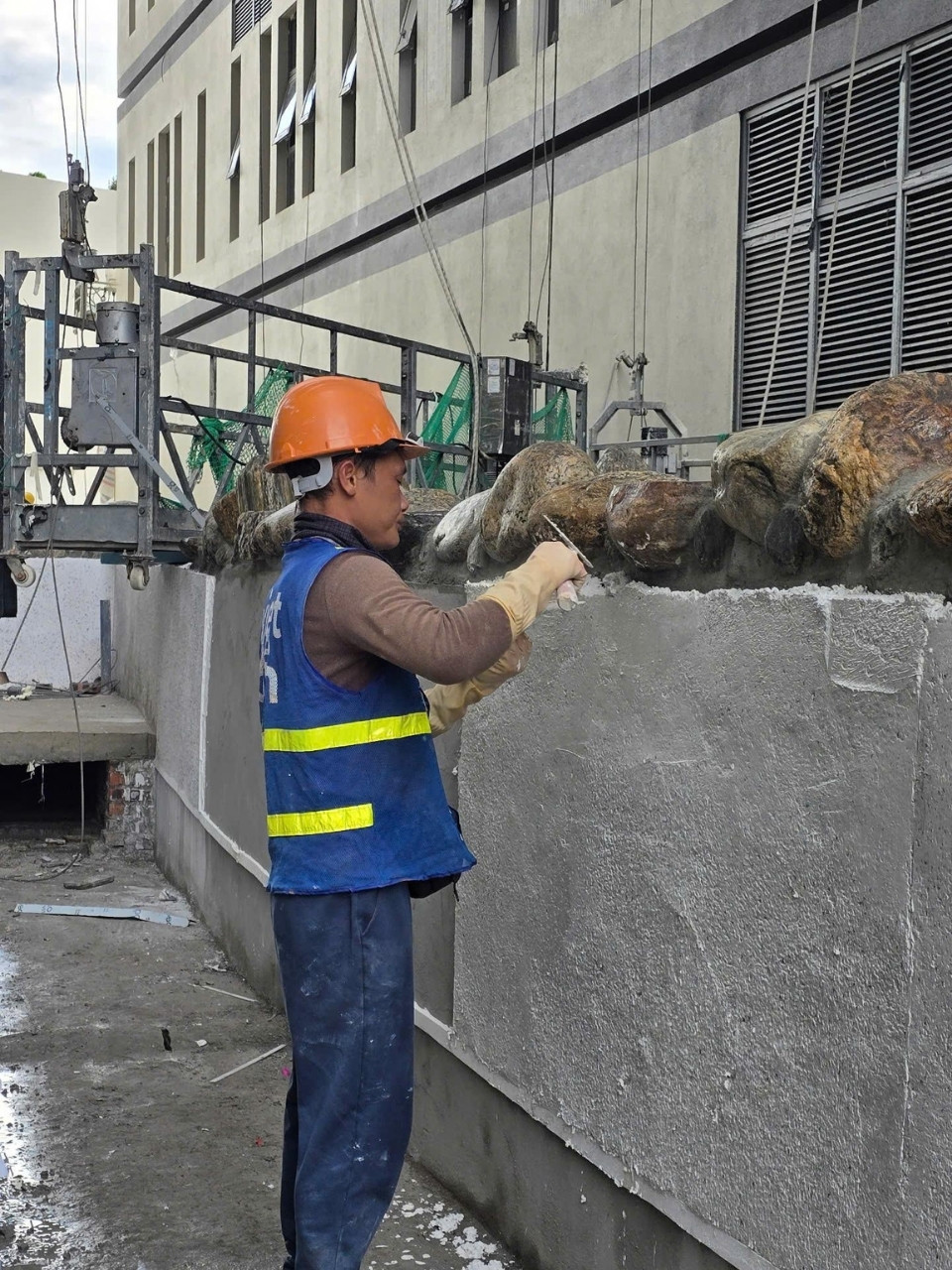 Được xây dựng liền kề khu bệnh viện đang vận hành, dự án đòi hỏi kiểm soát nghiêm ngặt về tiếng ồn, bụi và quá trình thi công. Trong bối cảnh đó, việc triển khai các mảng sỏi rửa ngoại thất được Vietbeton thực hiện theo quy trình tối ưu, vừa đảm bảo tiến độ, vừa hạn chế ảnh hưởng đến môi trường xung quanh, đồng thời tạo nên các bề mặt cảnh quan có độ bền và khả năng chống trơn trượt cao.
