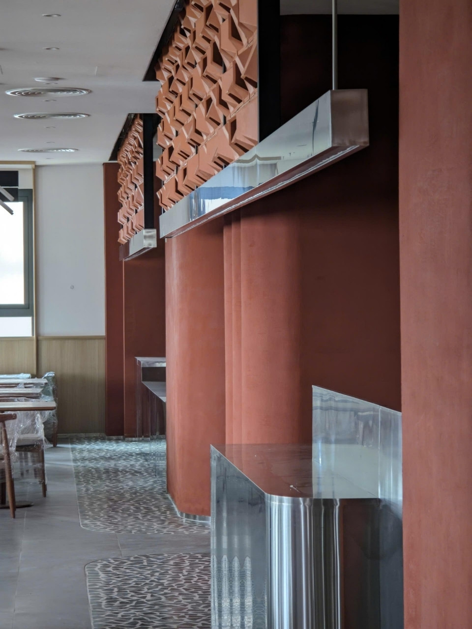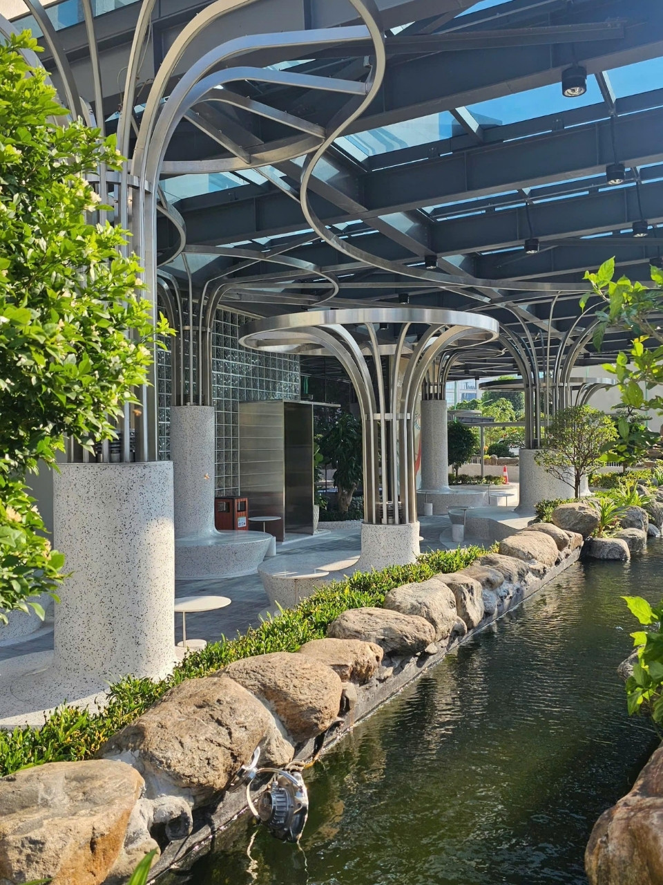 Trong tổng thể đó, Vietbeton đảm nhận thi công các hạng mục terrazzo, sỏi rửa và tường vữa đất, góp phần định hình ngôn ngữ vật liệu bền vững xuyên suốt công trình. Các khu vực sử dụng terrazzo không chỉ yêu cầu độ bền cao, mà còn phải đảm bảo bề mặt liền mạch, duy trì tính thẩm mỹ lâu dài.