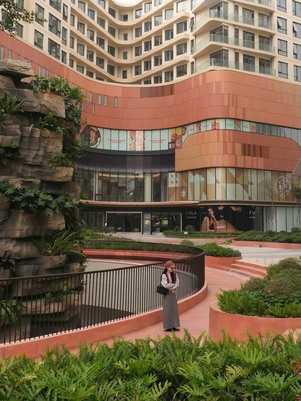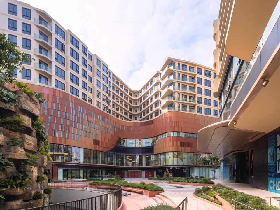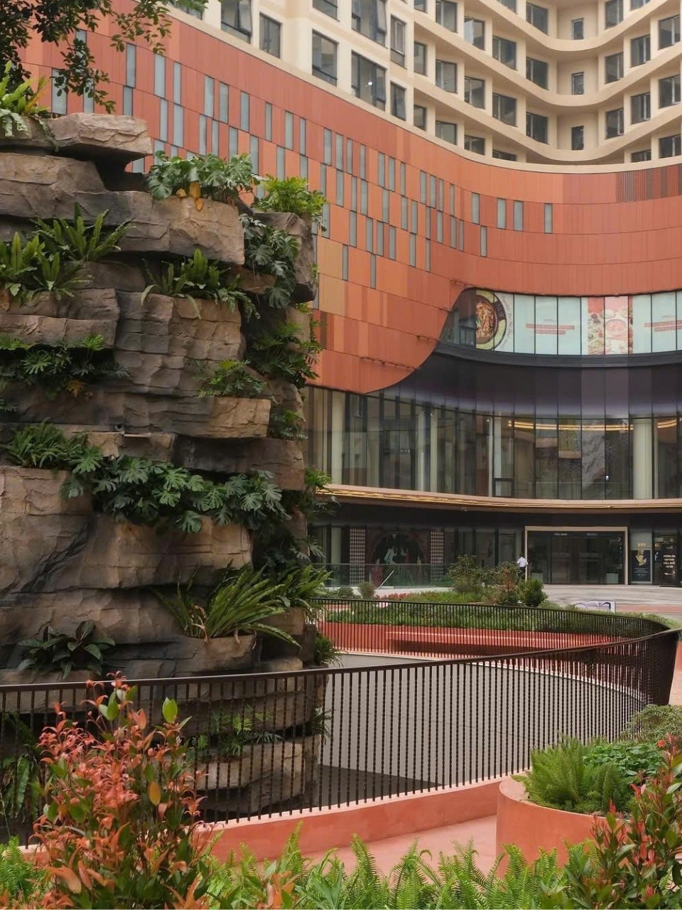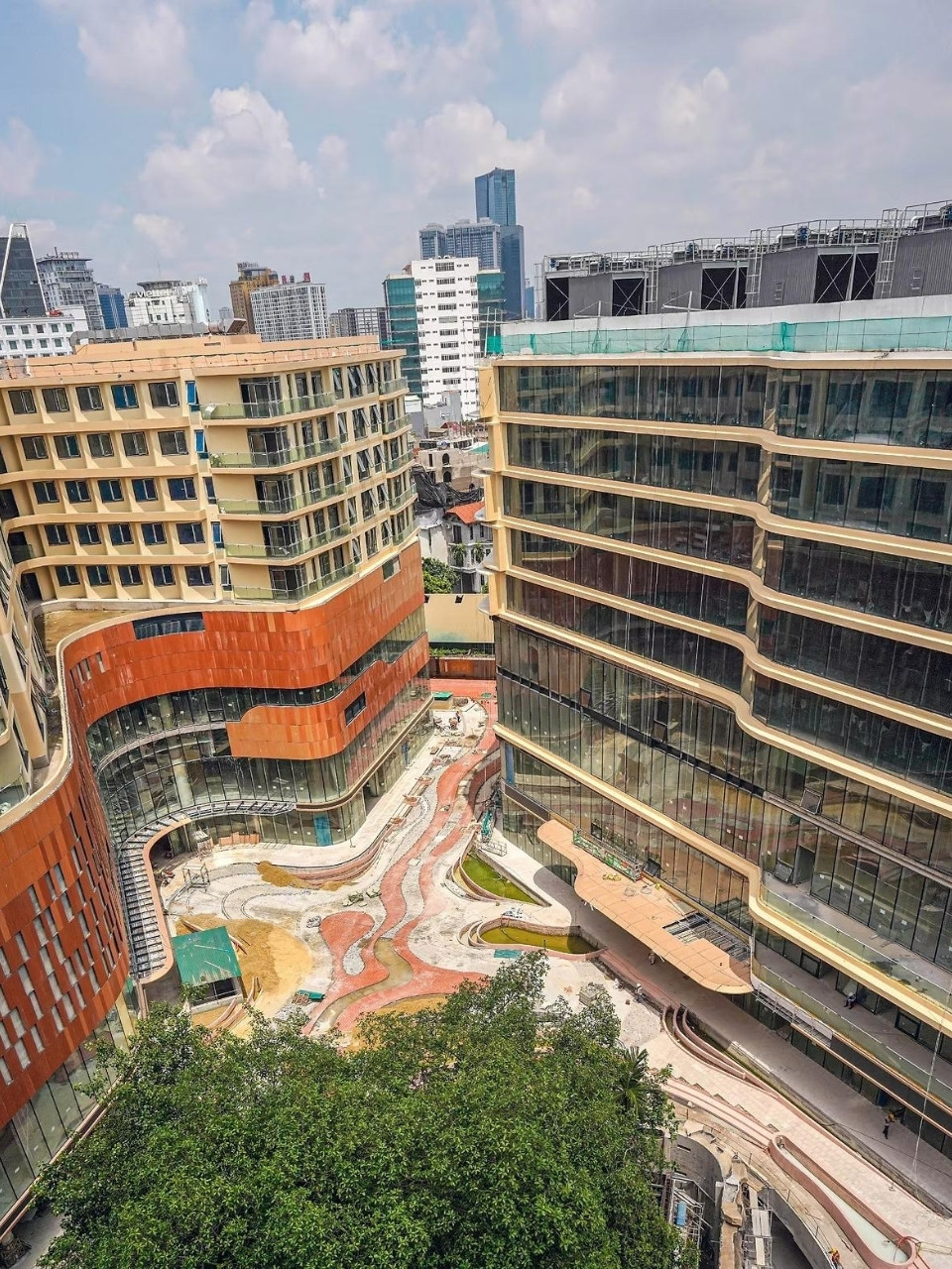 Trên diện tích hơn 16.000 m² cảnh quan ngoài trời, các hạng mục như quảng trường, lối dạo bộ, khu vườn và mặt nước được kết nối hài hòa. Trong đó, giải pháp cát rửa do Vietbeton thi công đóng vai trò quan trọng tại các khu vực ngoại thất, mang lại bề mặt tự nhiên, chống trơn trượt và phù hợp với mật độ sử dụng cao, đồng thời giữ được sự đồng điệu với không gian xanh tổng thể.